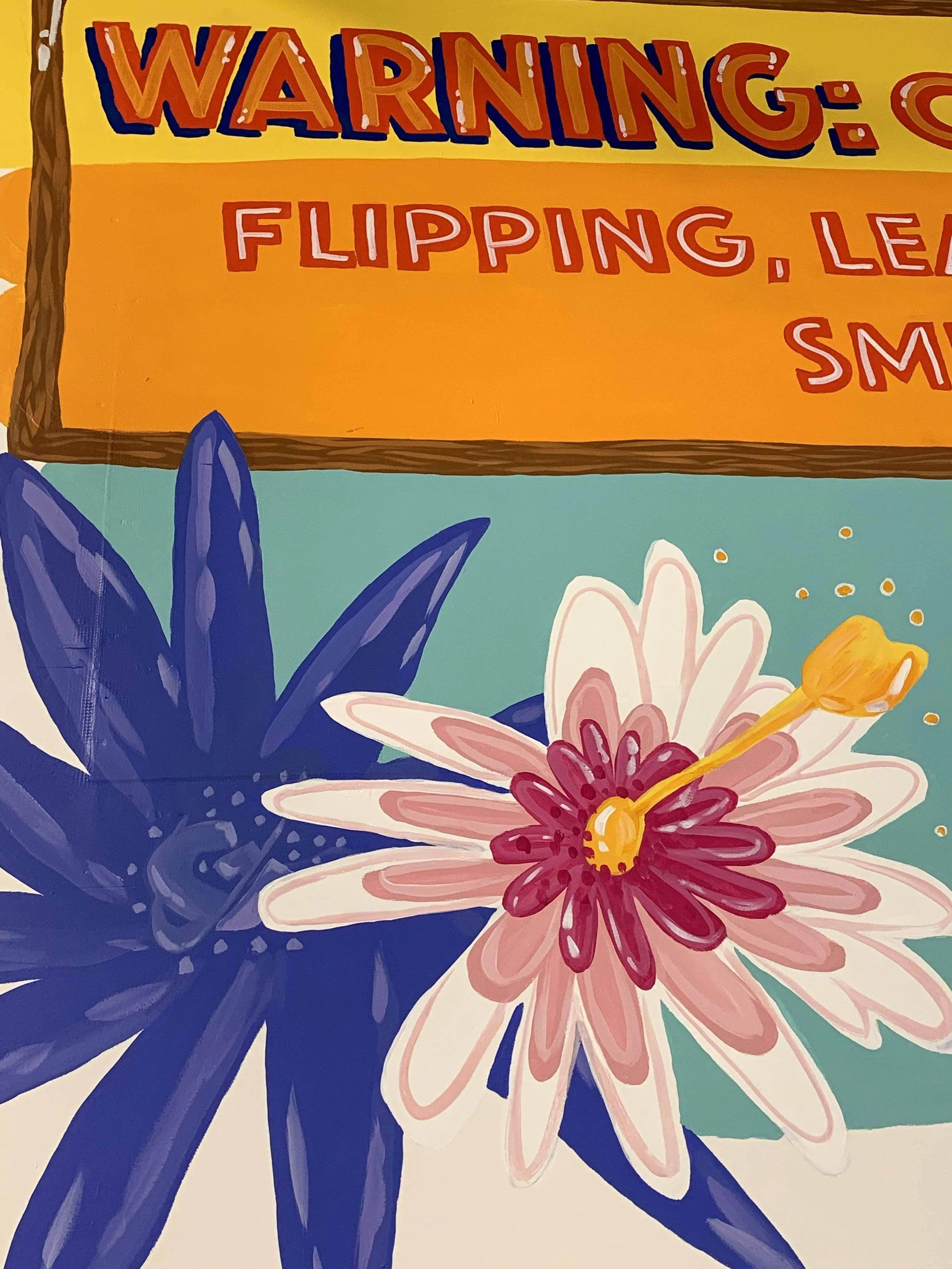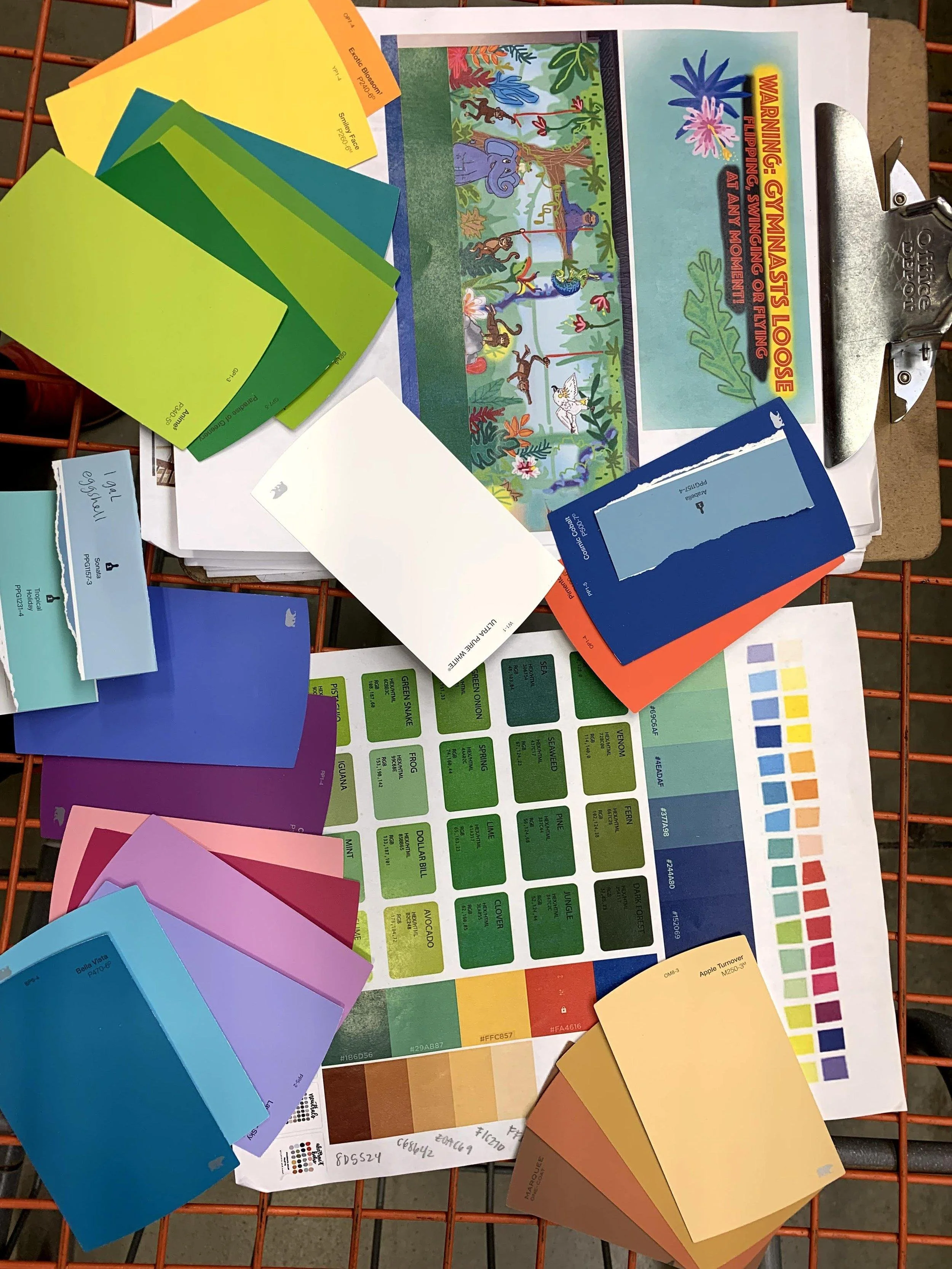 This mural was the finishing touch to a new location opening - one that would focus on classes and camps, allowing the competitive teams to have their own location. We wanted the vibe to be playful, bright and active, as well as fill this large space with interest. We added some special secret things to look for, including (12) hidden GForce logos throughout the mural for kids and parents alike to be challenged with a little I-Spy!