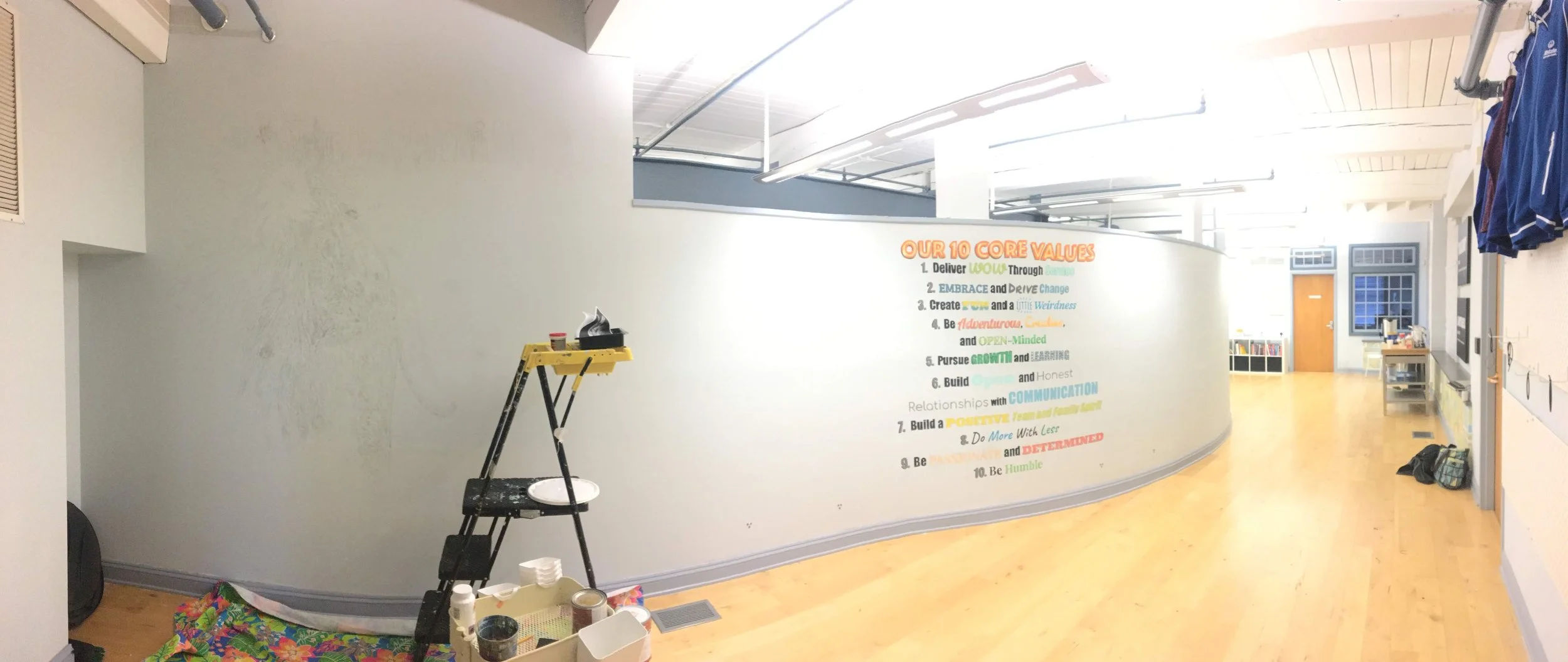 Most wouldn’t imagine an insurance company being a creative environment, but this owner knew the benefits of a GREAT workplace on employees and was all IN. When opening this new office location, he wanted to make sure it was a place that would inspire and celebrate the people working there. Working with Fun Places from the beginning, we incorporated elements completely around the office - including global collage walls, impactful entry mural, quirky painted “core values”, framed inspiring quotes, employee recognition area, coffee bar, humorous signage, dry erase & colorful interactive national map of the companies’ regions, and other components to make this a really enjoyable office to be in & shares intention in every concept!