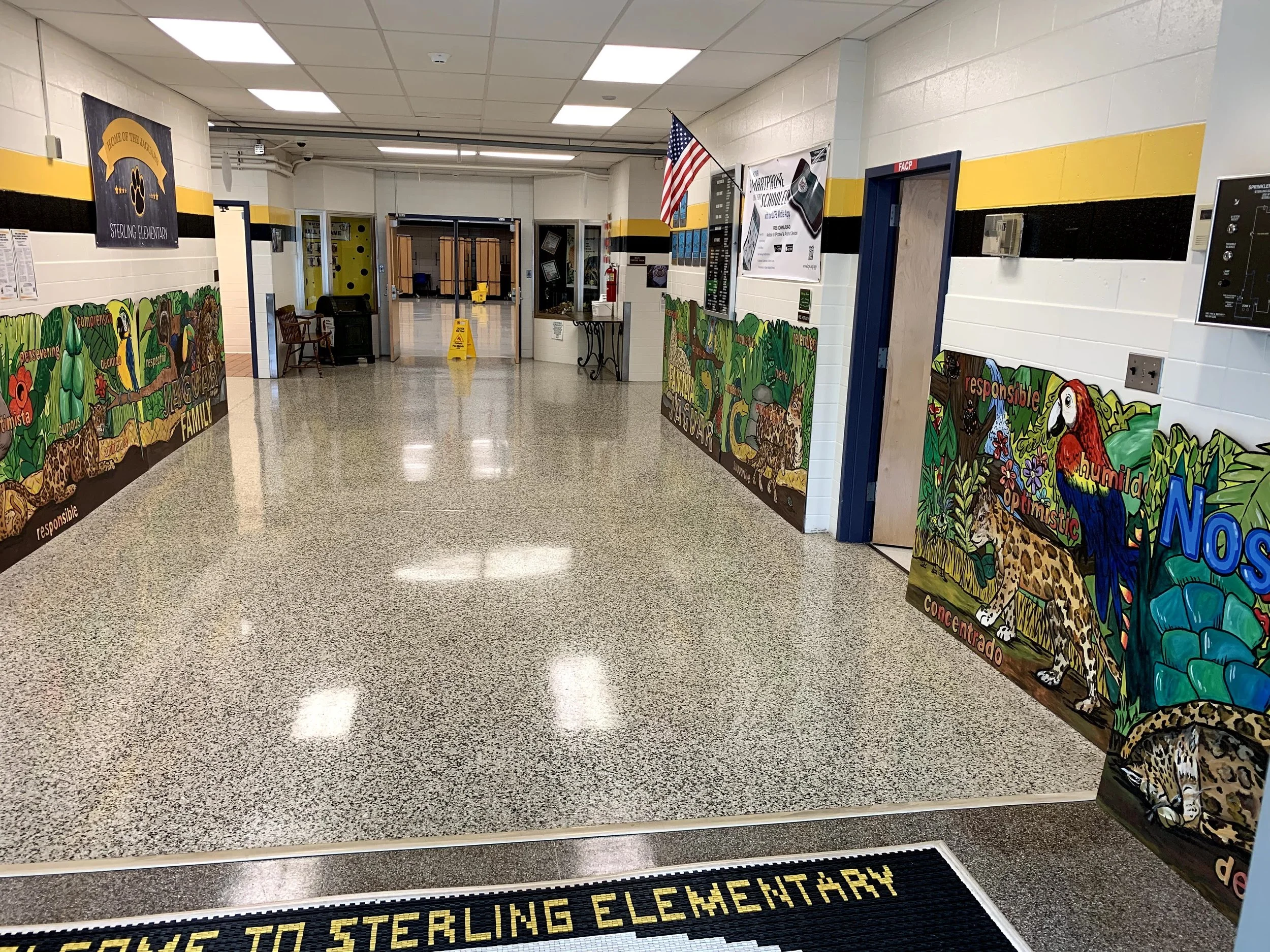 Fun Places collaborated with students at Loudoun School for Advanced Studies (LSAS) in this months long service project - to secretly work with the principal at Sterling Elementary, a diverse Title 1 school nearby, to design and create an uplifting entrance mural to be installed secretly. LSAS students did a fantastic job, led by Fun Places, to concept, cut, and create over 50’ of panel murals over the winter months. These panels both reflected the Jaguar spirit of the school and shared character traits, in Spanish and English, that educators wanted to instill in students there every day. With only the principal still knowing, LSAS artists secretly installed panels into the entrance during a school day to surprise students with their colorful new gift and stayed around to give high 5’s and see their reaction. It was a WIN for all - a joy to give and a great addition to the school!
